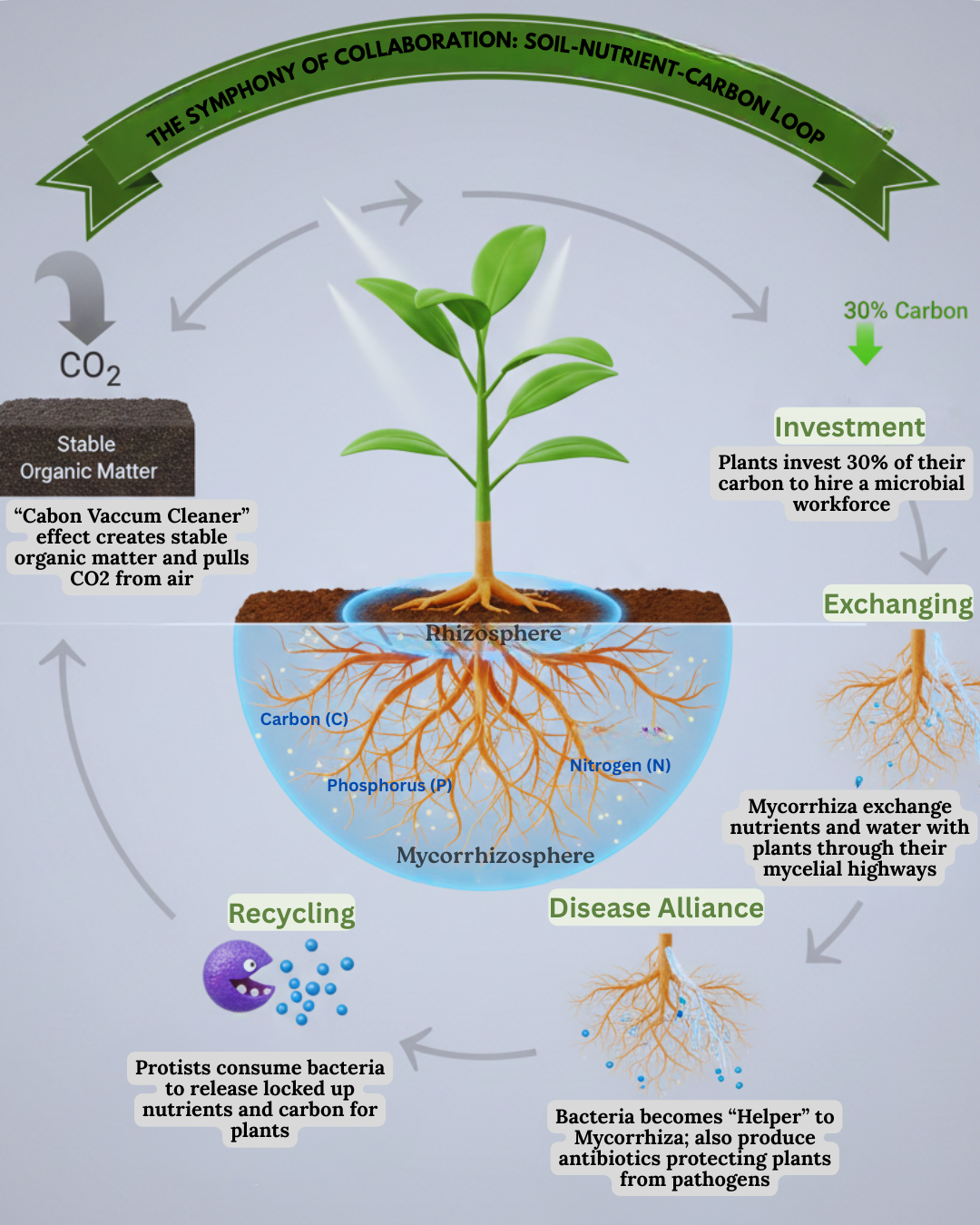 The plant pays fungi and bacteria with carbon (sugars). Bacteria process raw materials. Protists then consume bacteria, releasing plant-ready nutrients right onto the fungal highways. Fungi deliver these nutrients back to the plant. The plant, now healthier, photosynthesizes more, funding the next cycle.